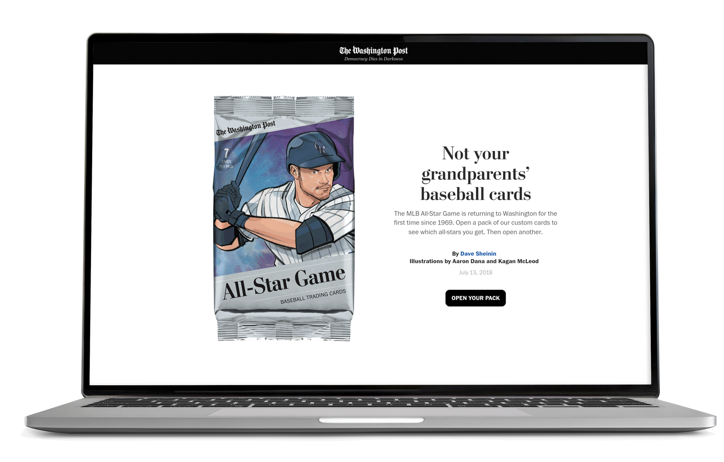 In addition to physical baseball cards, we also published a delightful digital presentation where readers could “open a pack” of cards.