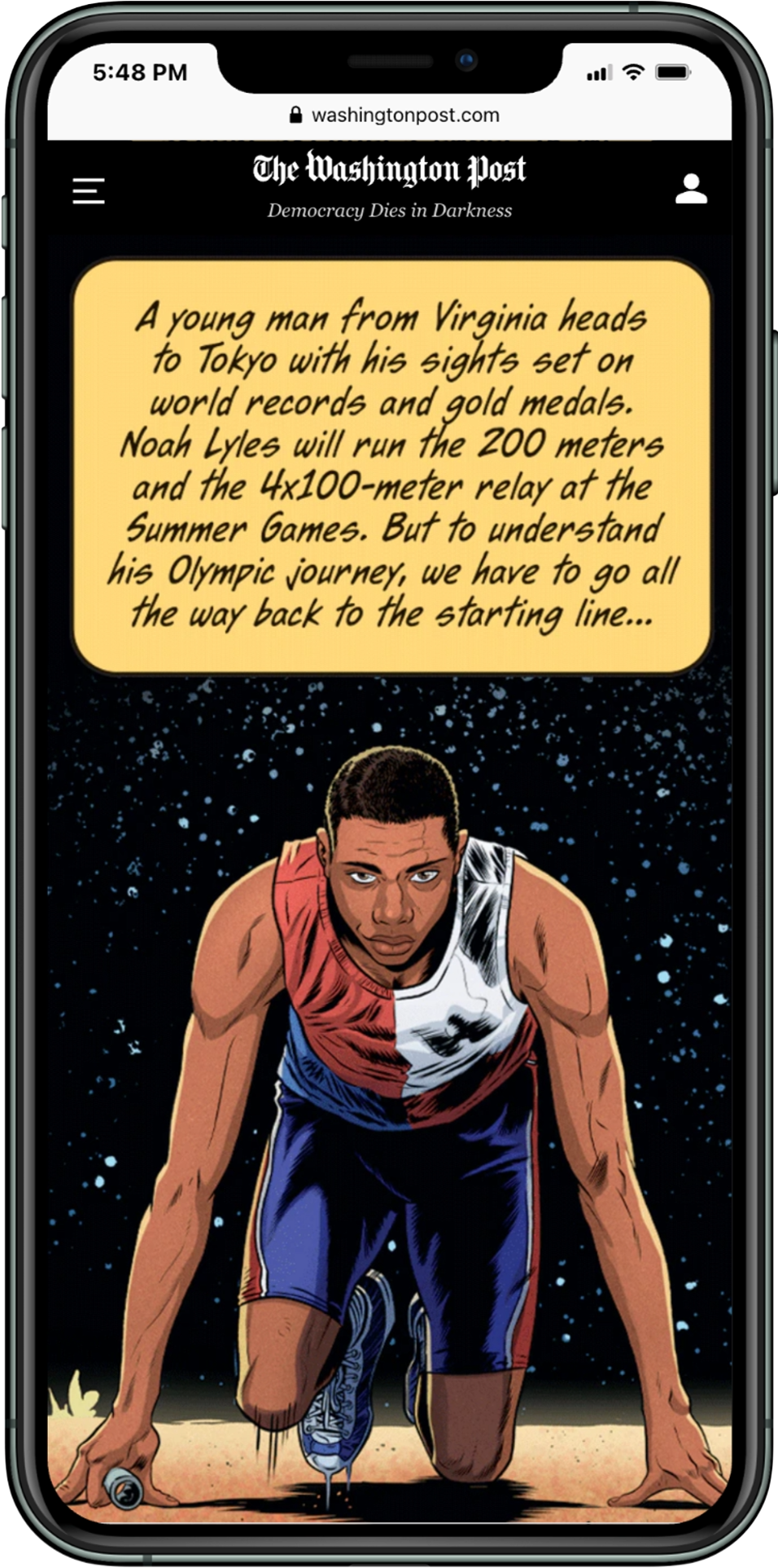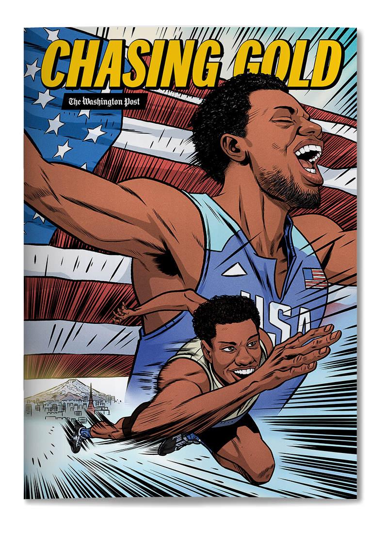 We published a full-color 22-page comic book about Noah Lyles, a Washington, D.C. native that was expected to win the gold medal in track and field. The comic book was inserted into the print edition of The Washington Post and the comic book was reproduced in full as a digital experience. This was a huge art direction effort that involved a team of artists, colorists and letterers to produce the comic.